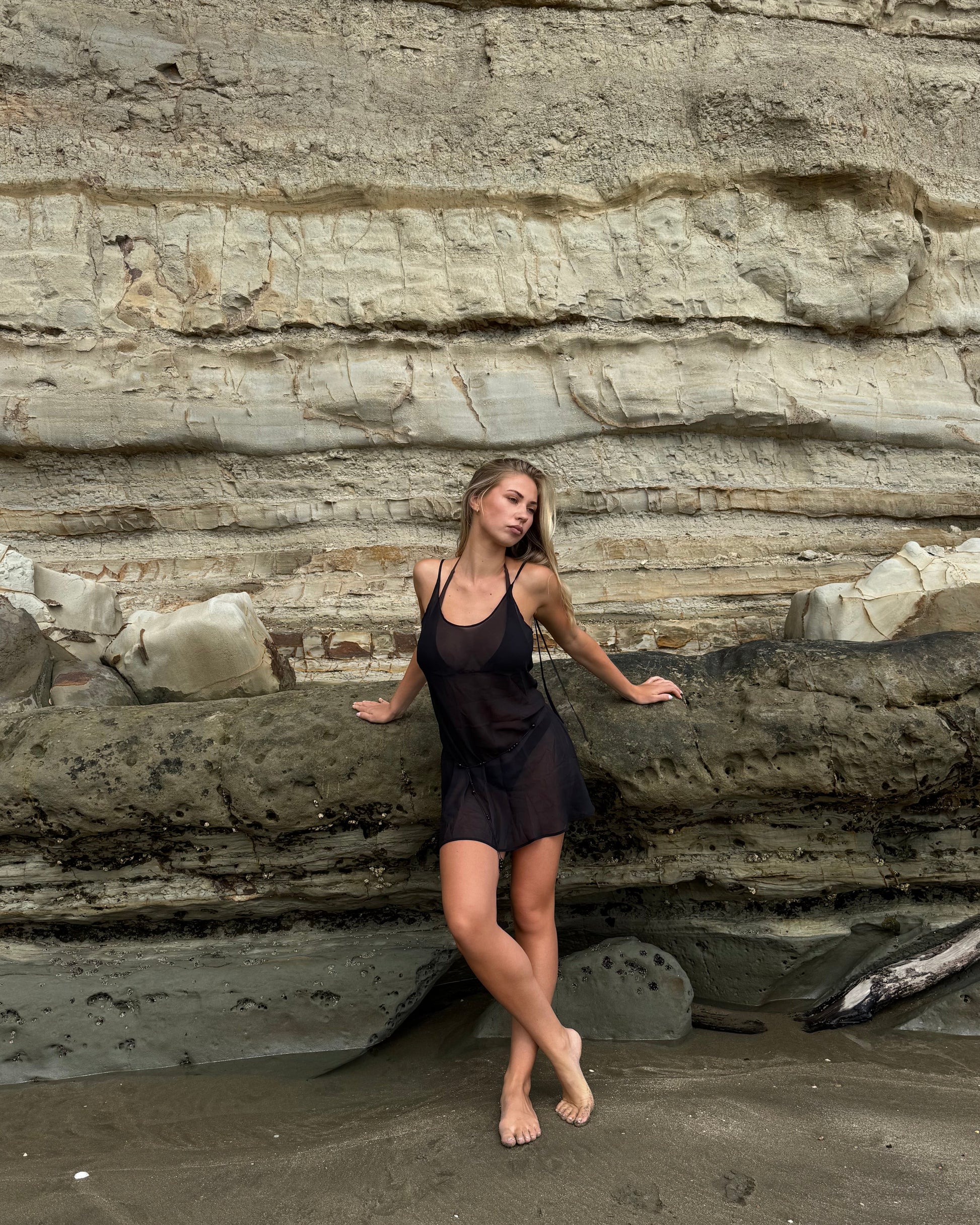 A perfect slip on, all occasion mini dress. Crafted from silky chiffon, that is elegant and can be thrown on over a bikini or paired with a slip underneath. Featuring long ties, that are adjustable to your desired length, creating a halter tie or straight tie. Style with jandals or kitten heels.